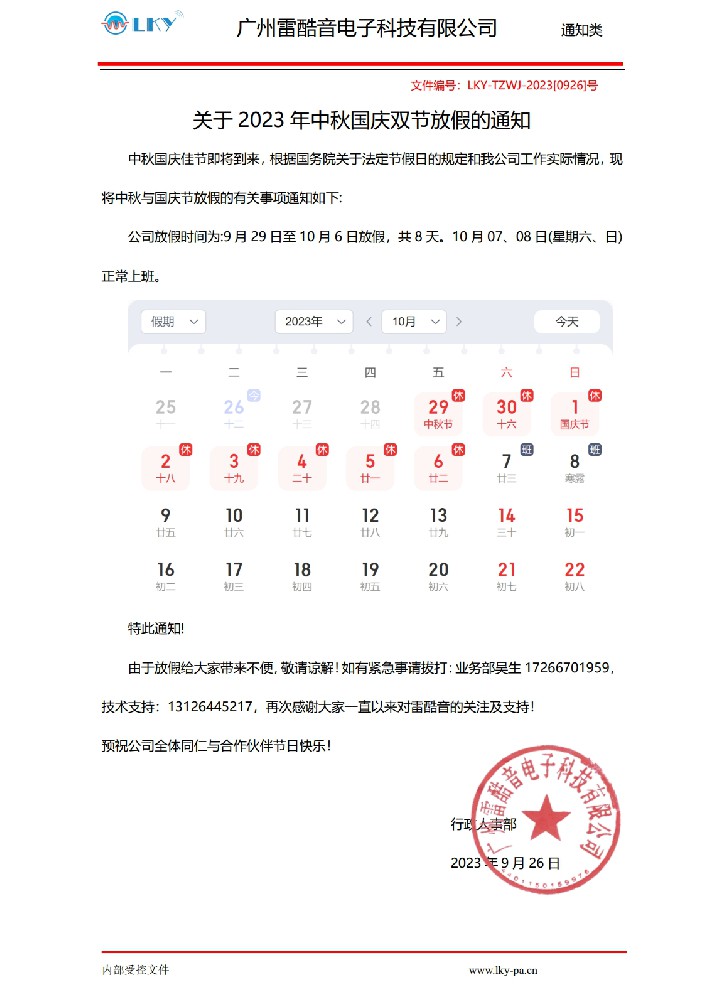 文件編號:LKY-TZWJ-2023[0926]號關于2023年中秋國慶雙節放假的通知中秋國慶佳節即將到來,根據國務院關于法定節假日的規定和我公司工作實際情況,現將中秋與國慶節放假的有關事項通知如下:公司··· 2023-09-26